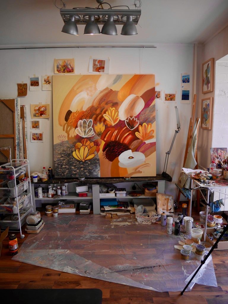 Лише коли настало літо, і я побачила, як розквітли мої улюблені півонії, я відчула, що знову ожила, і захотіла створювати мистецтво далі між відчуттям життя та смерті. Я насолоджувалася улюбленими квітами, а сама ідея квітки формально, як знак, нагадує мені вибухи, до яких я була дуже близька в кінці лютого. Від однієї точки до периферії, як розширення. Згодом я взнала, що є навіть українські гармати з назвою Піони. Ці вибухи досі відбуваються по всій Україні через те, що російські ракети бомблять наші цивільні об’єкти, ми досі воюємо та захищаємось від російських загарбників. А квіти продовжують цвісти, незважаючи ні на що.