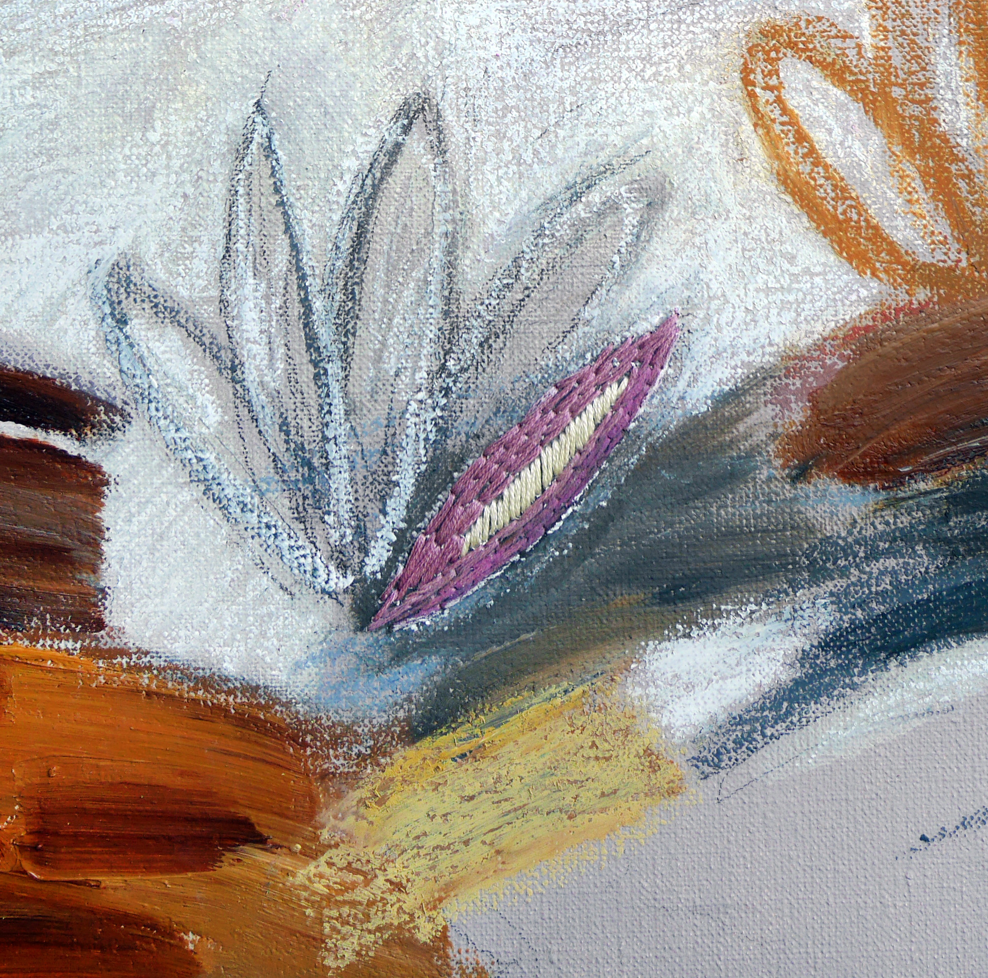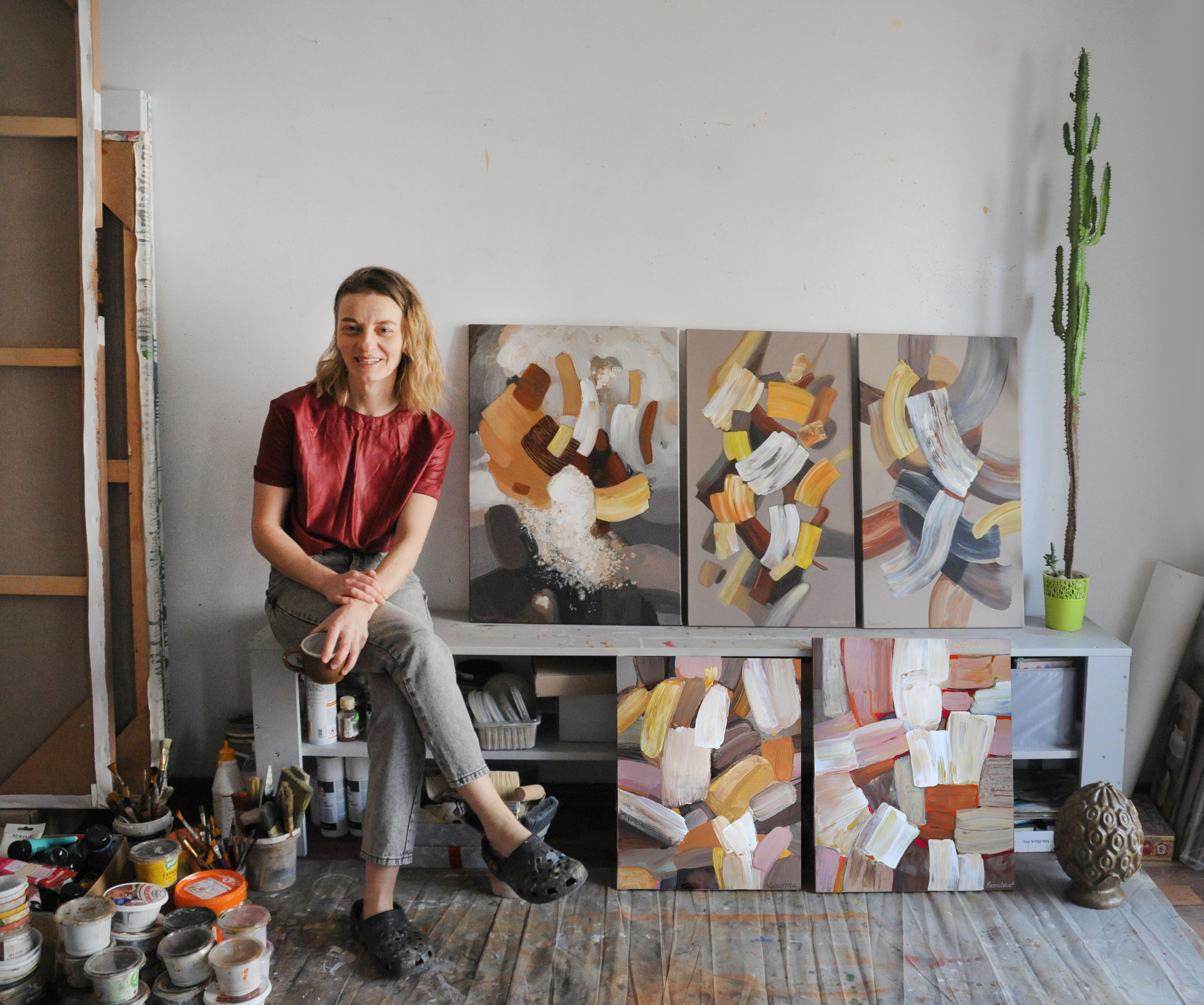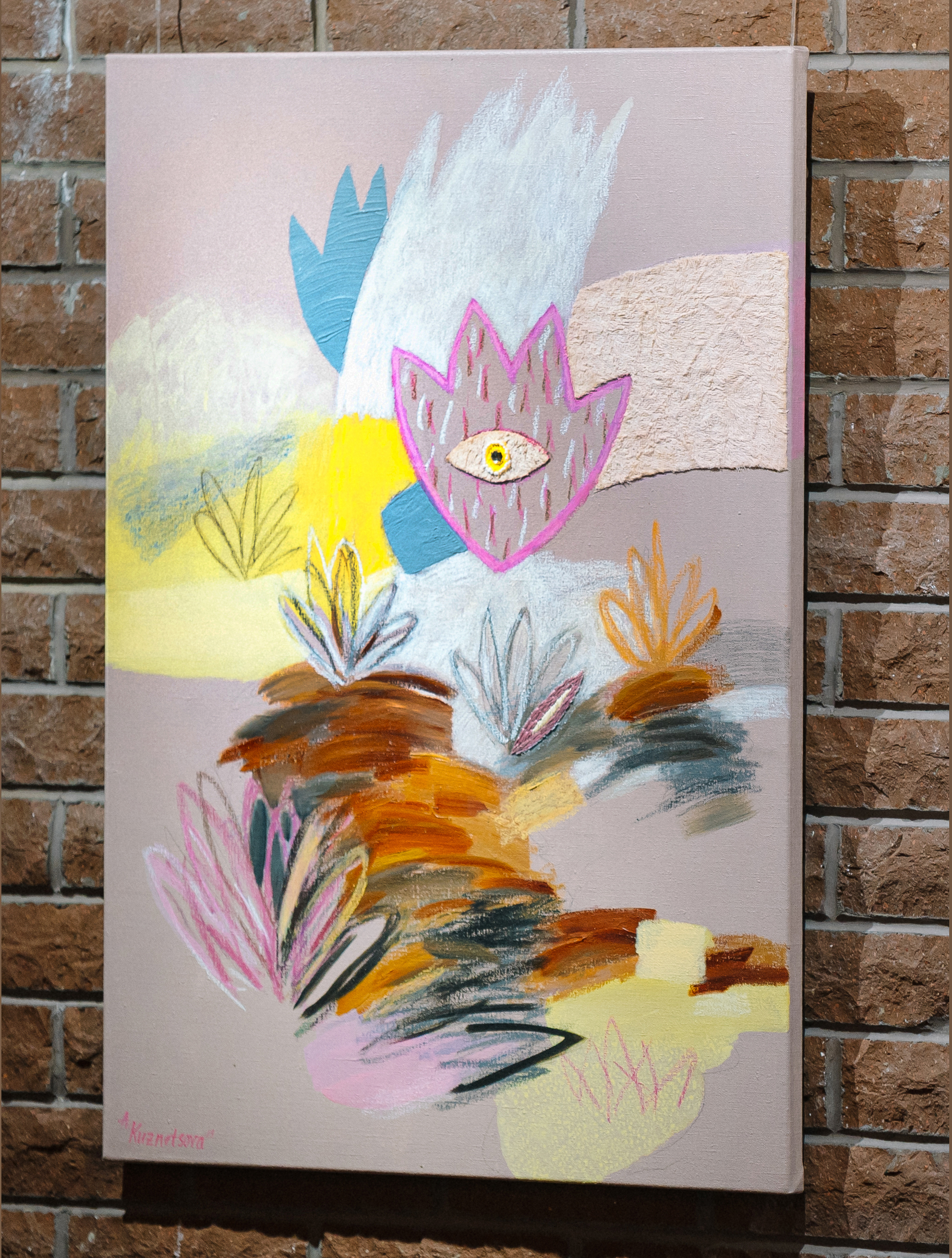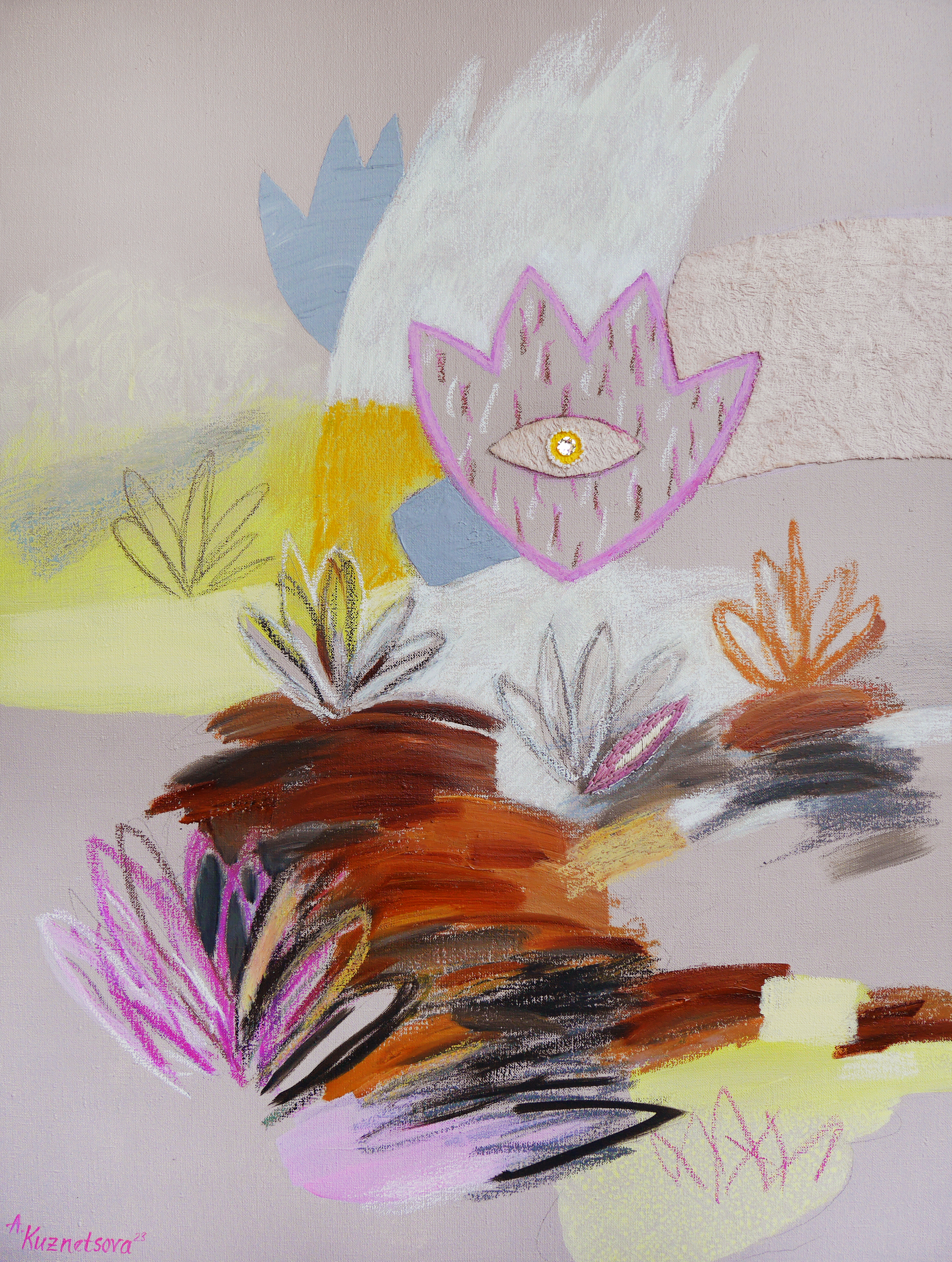 This series of works by Alena Kuznetsova departs from the previous, completely dissolved, and tranquil liquid series and addresses the composition, graphics bordering abandoned esthetics, layers of lines, and planes. There, traditional color as an independent medium is subjected to the form and is essentially of secondary significance. It is a separate musical instrument in an orchestra: it just plays its part. Continuing the tradition of mixed technique, Alena takes these media apart into layers as the layers of memory, working without sketches and deciding at every stage on the choice of the next layer: acryl, oil, spray paint, oil pastel, enamel, and again acryl (the order may vary).