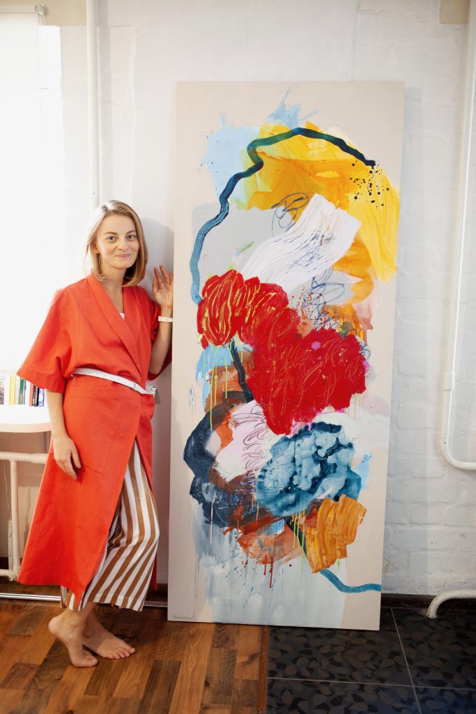 This series of works by Alena Kuznetsova departs from the previous, completely dissolved, and tranquil liquid series and addresses the composition, graphics bordering abandoned esthetics, layers of lines, and planes. There, traditional color as an independent medium is subjected to the form and is essentially of secondary significance. It is a separate musical instrument in an orchestra: it just plays its part. Continuing the tradition of mixed technique, Alena takes these media apart into layers as the layers of memory, working without sketches and deciding at every stage on the choice of the next layer: acryl, oil, spray paint, oil pastel, enamel, and again acryl (the order may vary).