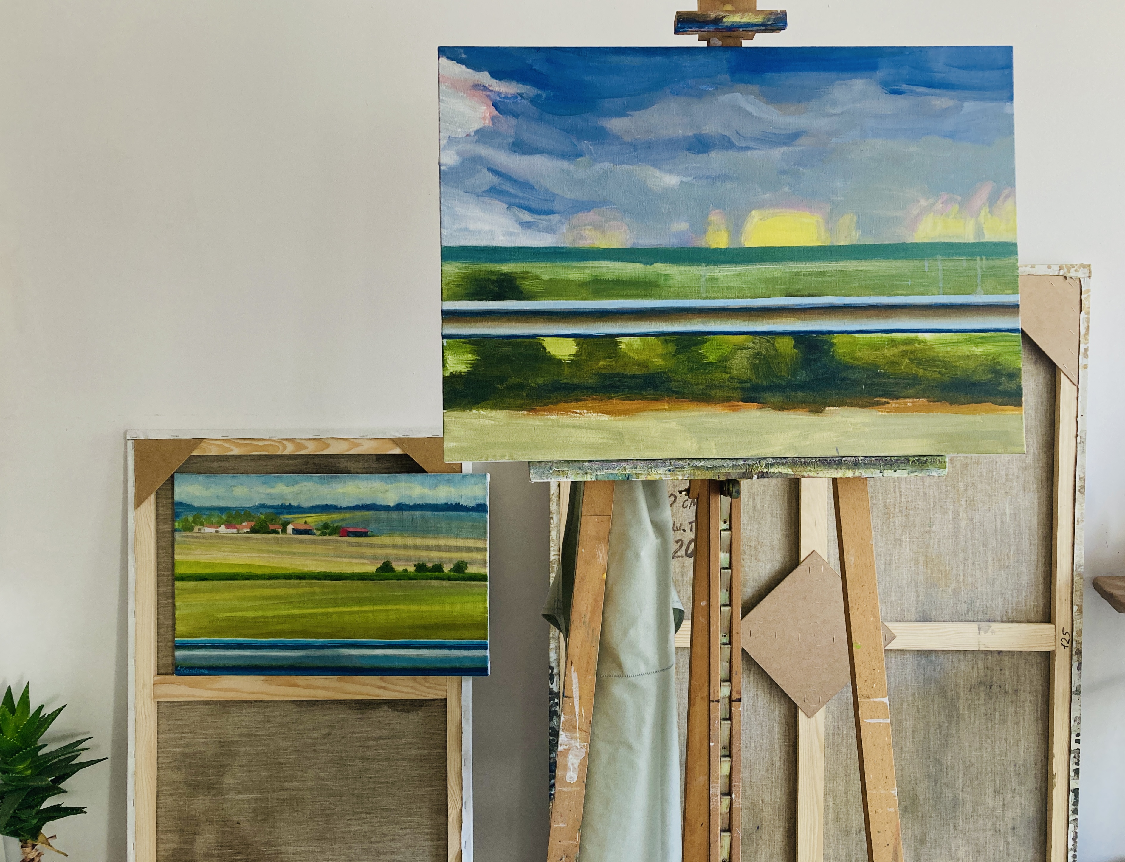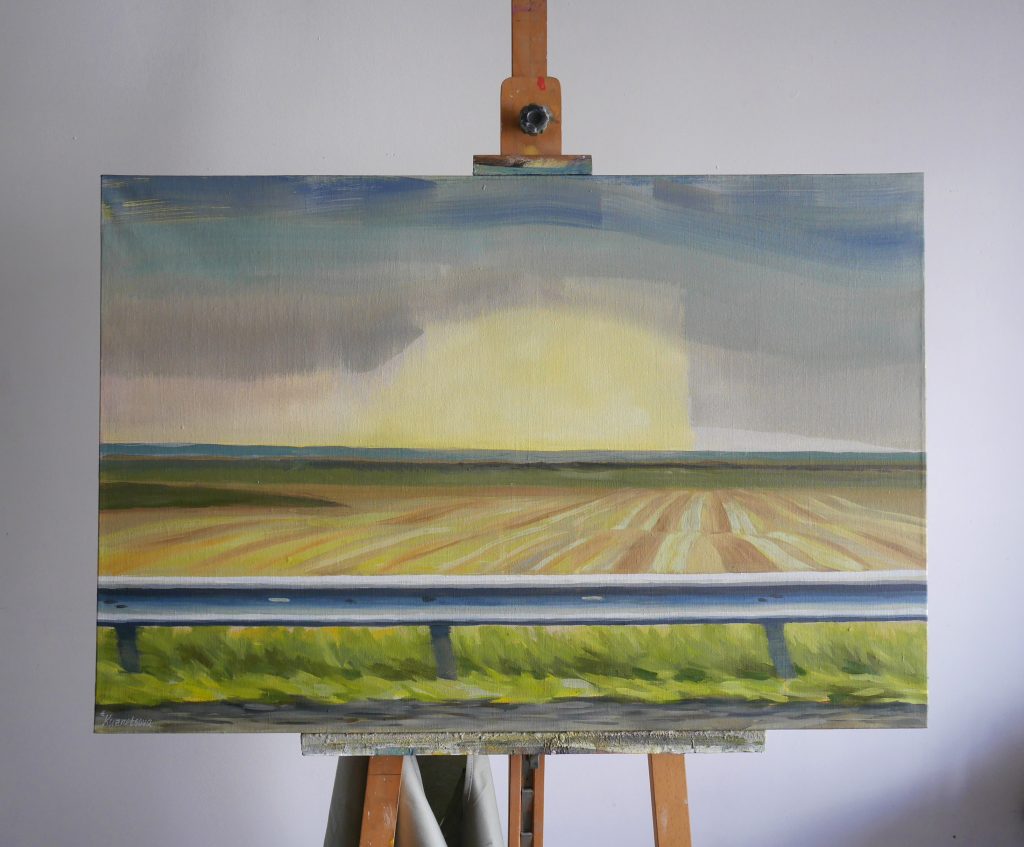 Following the beginning of Russia’s full-scale invasion of Ukraine in 2022, the project acquired a new layer of meaning. The works now evoke a heightened sense of fragility and temporariness. In recent years, the symbolic meaning of movement has changed profoundly. While travel may still offer expanded perspectives and opportunities — particularly for artists — it has also become more complicated and exhausting. With air travel unavailable from Ukraine, journeys have grown longer, familiar routes to the south remain inaccessible due to occupation, and some landscapes captured in these paintings may remain out of reach for years to come.