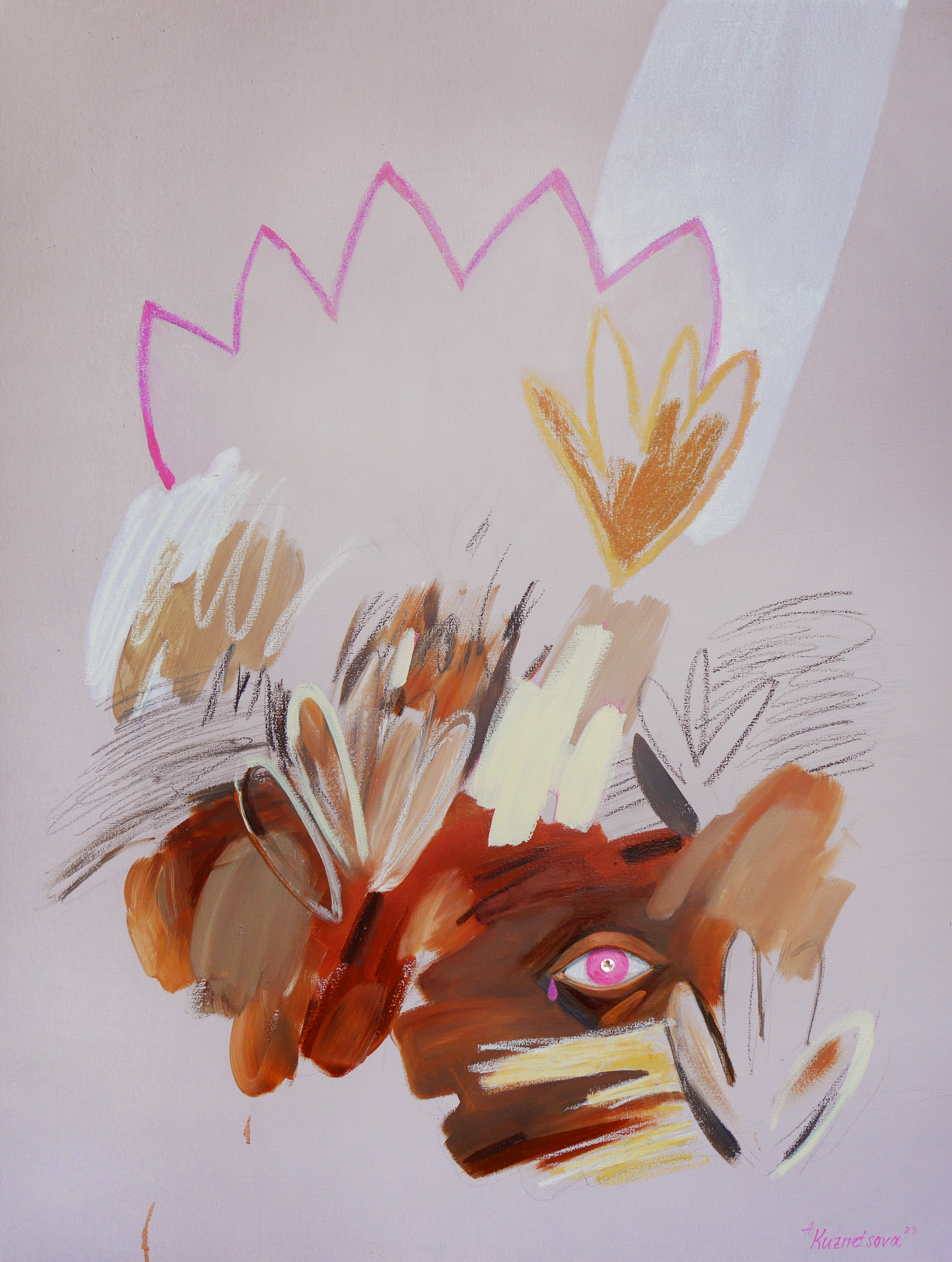 Протягом 2022–2023 років серія увібрала елементи примітивізму та дитячих спогадів: бабусині серветки, використані як трафарети, та півонії як символ раннього дитинства. Це виникає з прагнення повернутися до стану безумовного щастя, затьмареного війною. Символ «ока» у ранніх роботах уособлює нашу роль вимушених спостерігачів травми, навіть коли соцмережі приховували ці зображення як «чутливий контент».
