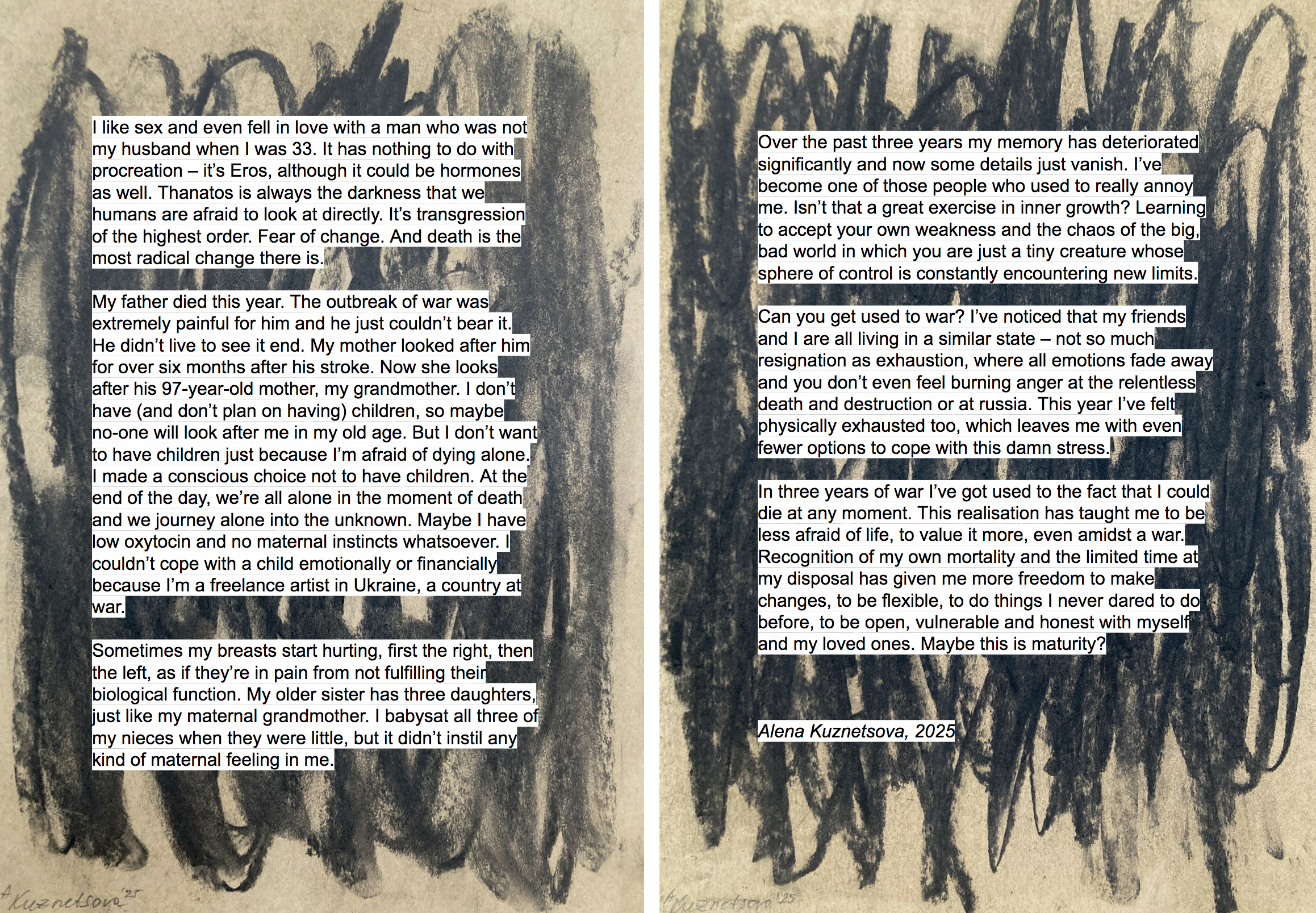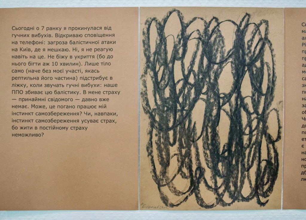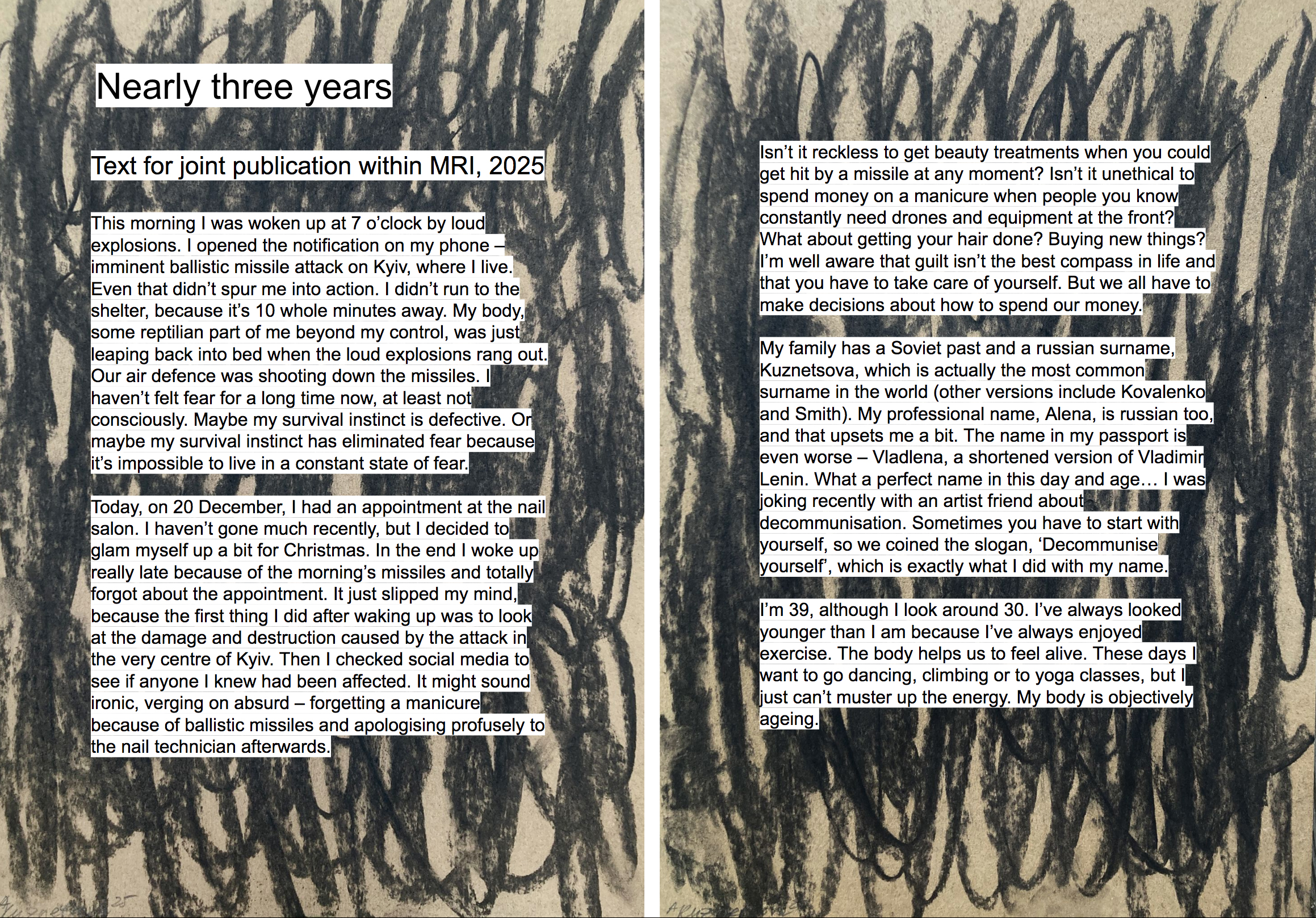 Моя частина в цій публікації доволі нетипова, а саме текст формату щоденника «Майже три роки». Моя мотивація участі у цій онлайн-резиденції, що тривала з жовтня, — саме робота з текстом, який мені чим далі — тим більше цікавий як самостійний медіа. Роботи моїх колежанок — досить різний спектр мистецьких медіа: фото, відео, документація, обʼєкти, живопис і звісно також текст… У нас не було однієї теми, але контекст обʼєднав нас: у всіх роботах відчувалось те, що ми всі зробили вибір залишитись в Україні, продовжуючи віднаходити сили і сенси.